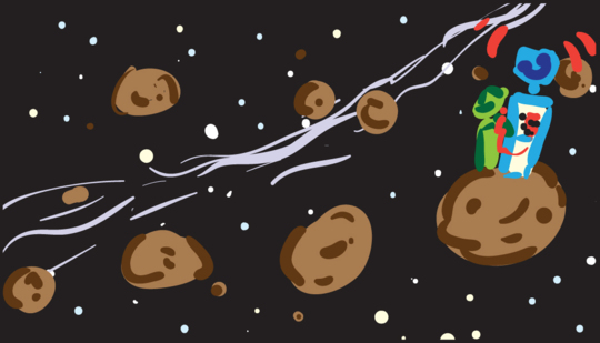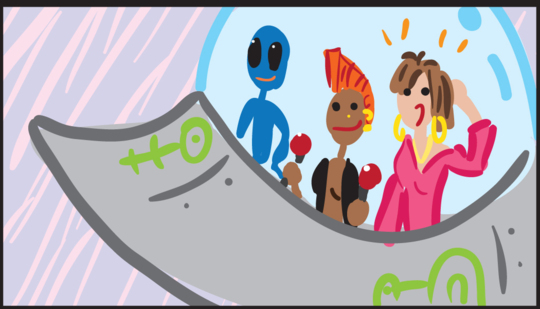Rachel and Roswell steal the Alien’s ship from Rachel, Roswell & The Alien by Dwayne Fry.